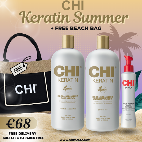 Discover the CHI SUMMER KERATIN 2025 set, featuring a complimentary CHI Beach Bag, a 946ml Keratin Shampoo, a 946ml Keratin Conditioner, and a 177ml Total Protect spray. This carefully crafted collection uses gentle, natural ingredients suitable for all hair types and textures, from curly to straight, dry to chemically treated. Experience healthier, shinier hair with a tailored routine designed to nourish and protect your locks throughout the summer and beyond. Don't miss out on this exclusive offer to elevate your hair care regimen.