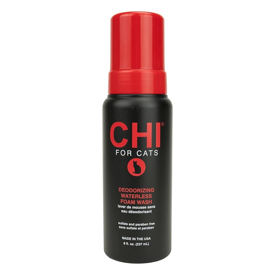 CHI for Cats Deodorizing Waterless Foam Wash helps keep your kitty odor free. This easy-to-use foam gets to work quickly eliminating odors so that your cat can look and smell her best.