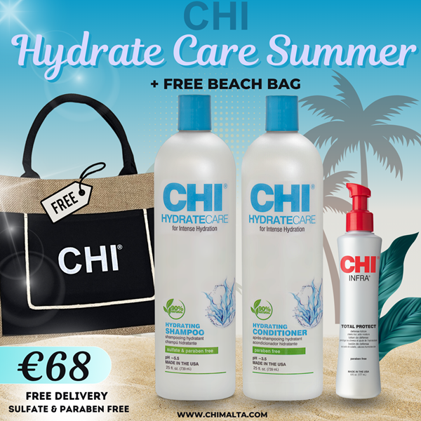 Experience the CHI Summer Hydrate Care 2025 collection designed to nourish and protect your hair all season long. This exclusive set includes a generous 739ml CHI Hydrate Care Shampoo and Conditioner, formulated with gentle natural ingredients to suit all hair types—whether curly, straight, dry, damaged, or chemically treated. The lightweight Total Protect spray (177ml) helps shield your hair from environmental stressors, maintaining its health and shine. Plus, enjoy a free CHI Beach Bag for your summer essentials. Embrace a hair care routine that supports moisture, radiance, and strength, keeping your hair vibrant every day.
