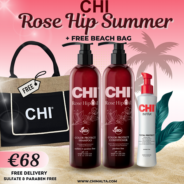 Experience radiant, healthy hair this summer with the CHI Summer Rosehip Collection. This exclusive set includes a gently cleansing Rosehip Shampoo (739ml), a moisturizing Rosehip Conditioner (739ml), and a protective Total Protect spray (177ml). Designed for all hair types and textures, these natural formulas nourish, restore, and add intense shine—whether your hair is curly, straight, dry, or chemically treated. Plus, enjoy a free CHI Beach Bag to keep your essentials stylishly organized. Treat your hair to the care it deserves and reveal its natural beauty every day.